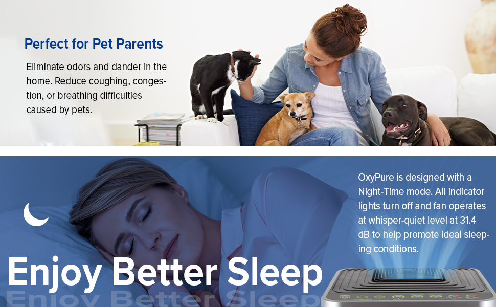 - ALLERGY RELIEF & BETTER SLEEP – National Sleep Foundation found that sleep is dramatically impaired by allergy symptoms. OxyPure promotes better sleep by eliminating airborne allergens that can irritate the sinuses, nasal passages, and lungs.