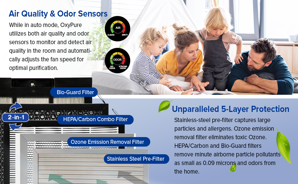 - UNPARALLELED 5-LAYER PROTECTION: Dynamic combination of a stainless steel pre-filter, ozone emission removal filter, True HEPA and Carbon filter, and Bio-Guard filter effectively captures 100% of 0.09-micron particles in the air, including pollen, pollutants, smoke, pet dander, dust, and other allergens. It also eliminates toxic Ozone in the home to less than 1 ppb, offering an ozone free space.