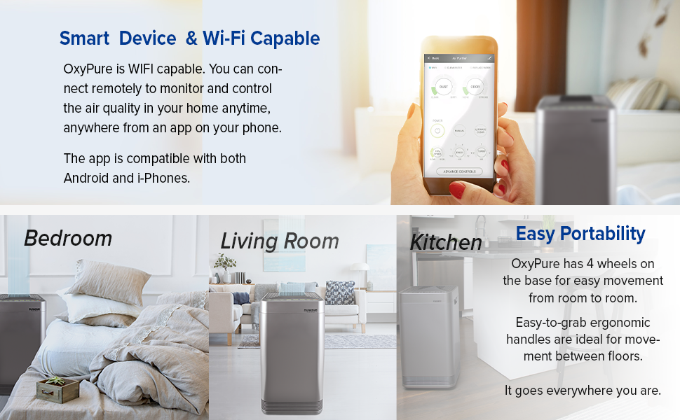 - WIFI CAPABLE: OxyPure is WIFI capable. You can connect remotely to monitor and control the air quality in your home anytime, anywhere from an app on your phone. The app is compatible with both Android and iPhones.