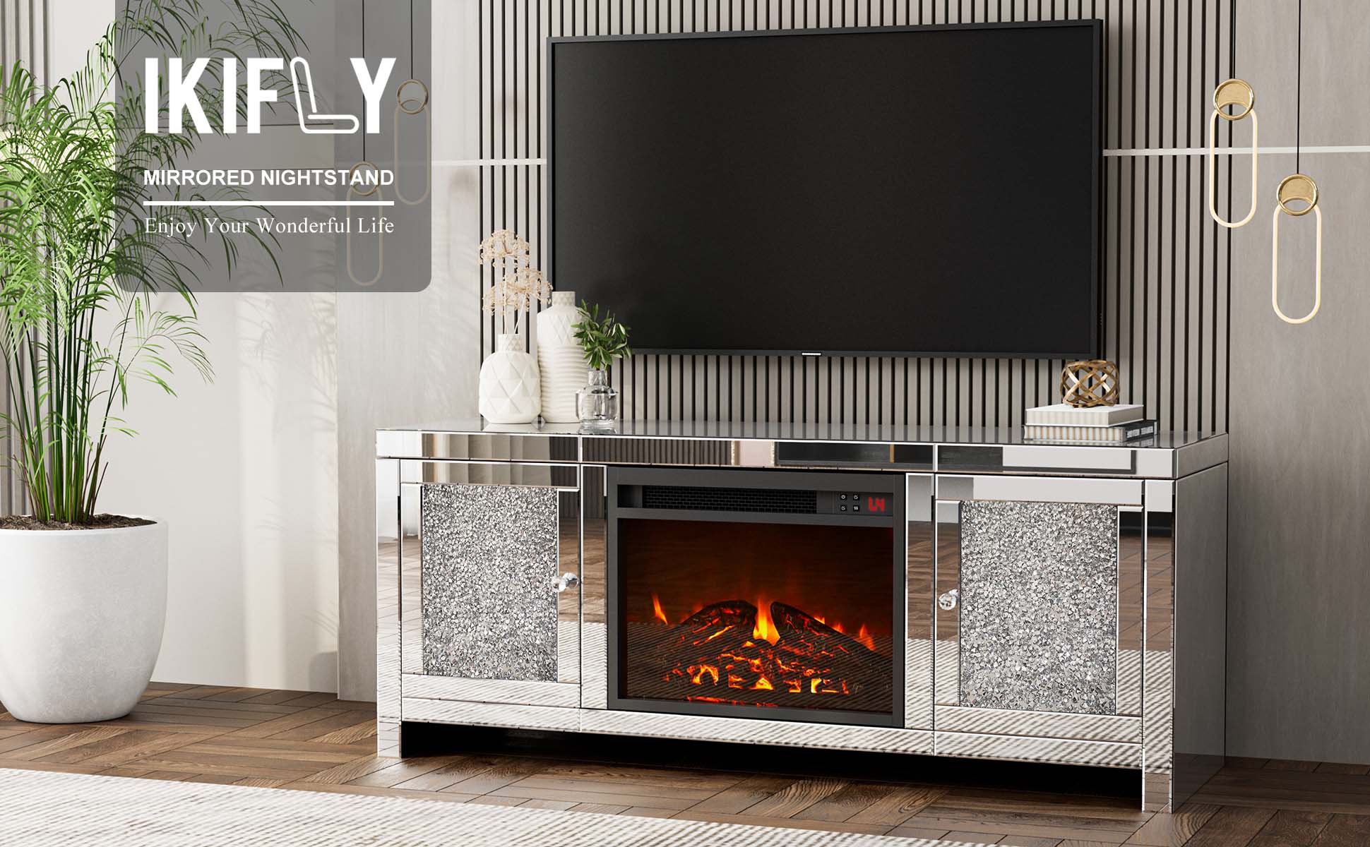 💎【High-Quality & Easy To Clean】The mirrored Fireplace TV Stand adopts high-Quality MDF board and smooth glass mirrored finish. A drawer with diamond handles for storage needs. Smooth surface of this Tv stand makes your cleaning more easier. The stains left on the tv stand can be quickly wiped, which also reduces your annoyance accordingly.