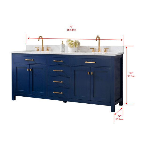 This transitional vanity combines contemporary lines to a traditional style. Maximize your bathroom space with this 72" vanity. Featuring a high-quality Carrara white engineered stone top on a solid wood frame. Available in white or gray with brushed nickel hardware, or navy blue or vintage green with satin gold hardware.