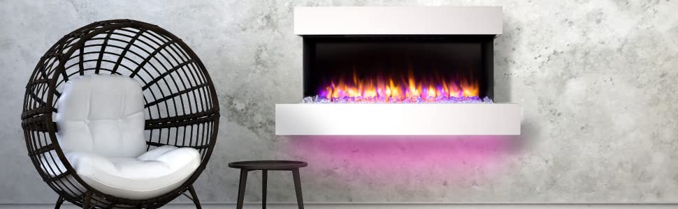 - 13 fuel bed and mood lighting options all provide a stunning display. Realistic crystals pebbles & logs included.