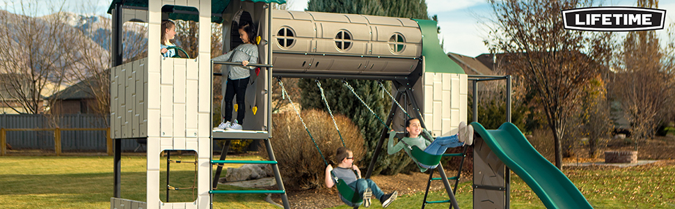 The Adventure Tunnel Playset from Lifetime Products is full of exciting activities for children ages 3-12. Constructed of UV-protected high-density polyethylene (HDPE) and powder-coated steel, it's durable, weather-resistant, and will not warp, rot, crack, or splinter. From the swing set and slide to the adventure tunnel, your kids will have no problem finding plenty of features to keep busy with. So let your kids enjoy the features and activities while you enjoy the low-maintenance and safety of a Lifetime Playset. The Adventure Tunnel Playset comes with a club house, tunnel, swings (2), Slide, Rope Ladder, and climbing walls (3). The club house has two door openings in the top level, as well as windows in the upper and lower levels. A rope ladder and a metal ladder lead up to the clubhouse. The tunnel rests on the bar above the swings, and leads to a separate platform that houses the slide and climbing wall. Another metal ladder reaches the slide platform. Comes with a 5-year.