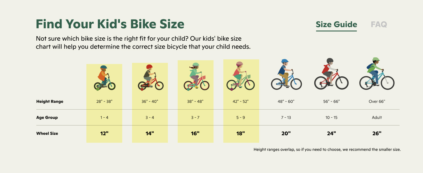 - This Koen kids bike with 18-inch wheels is is perfect for riding to the park or riding on the sidewalk around the neighborhood. The bike is designed for children 3 - 7 years old, or 42 - 52 inches tall