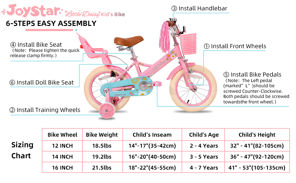 - 1. Amazing Design and Color! JOYSTAR Little Daisy Princess Girls bike with Bright colors, stylish and charming. DIY decals, beautiful basket and doll bike seat add extra fun to the ride. They have adjustable saddle & stem height for a better fit for easy pedalling. Complete with a bell that lets everyone know she's on the move.