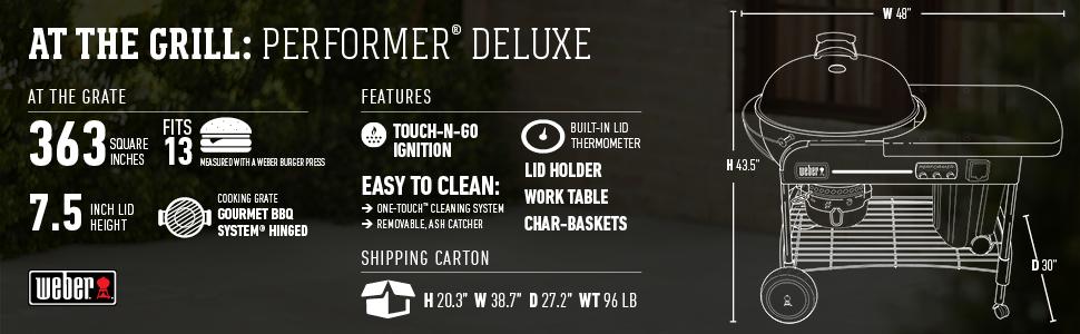 The Performer Deluxe grill features an exclusive Touch-N-Go gas ignition system that ignites charcoal briquettes with the push of a button. Especially handy is an LCD countdown cook timer with a large readout . The timer attaches to the grill or can be easily removed if you'd prefer to take it inside or keep it with you. The grill is outfitted with innovative heavy-duty Gourmet BBQ System cooking grates, a 2-part grate system that may be used in tandem with Weber's Gourmet BBQ System cookware collection. The grill's classic porcelain-enameled bowl and lid with a One-Touch Cleaning system and high capacity ash catcher make clean up hassle free. Storage options are plentiful with the CharBin storage container which protects your charcoal from the elements and a sturdy painted metal table is right at hand while grilling. Also features a wire bottom shelf, no-rust aluminum vent and a glass-reinforced nylon handle. Uses disposable 14.1 or 16.4 oz. LP cylinders.