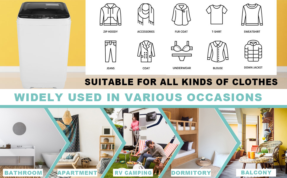 • Our practical washing machine with 10 programs is perfect for you. It has washing and dehydration functions, so you don't need to buy an additional dehydrator. You can control the water volume, mode and time of the washing machine at will. With a child lock function, the machine will not be interrupted when it is running. The side handle design is convenient to carry. The compact size is very suitable for your dormitory, apartment, apartment, RV, RV, camping.