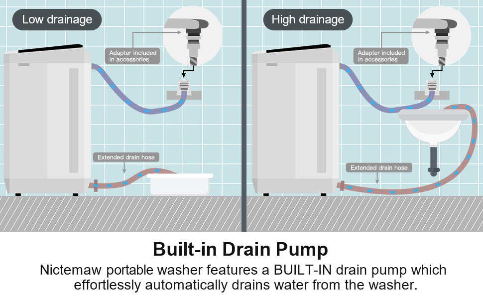 【2-In-1 Full Automatic Washer & Spin Dryer Combo】Designed with a Full-Automatic System, Equipped with a single cylinder & drain pump, the washing machine not only can be used to wash your clothes but also for drying them. And washing and dehydration can be used separately. You only need to set the washing/spinning program, and then it can work alone. The washing machine is equipped with an extended drain pipe and a drain pump to help your washing machine drain water easily and quickly.