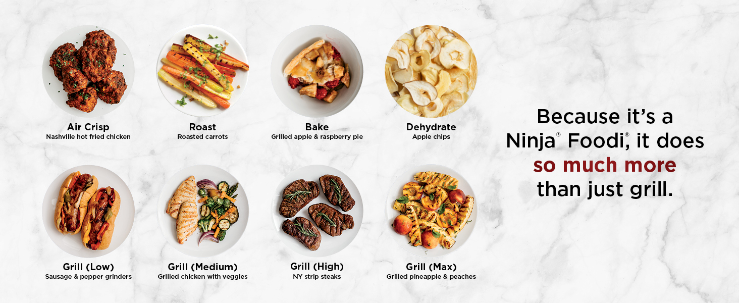 NINJA FOODI GRILL: The grill that sears, sizzles, and air fry crisps. New exterior look with all the great functions you love from the original Foodi Grill.