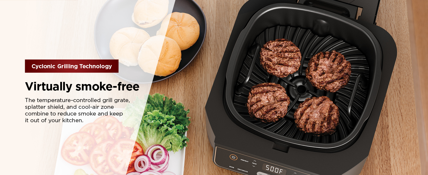 Meet the Ninja Foodi Indoor Grill. The grill that sears, sizzles, and air fry crisps. Updated sleek design from the original Foodi Grill. 500°F of hot cyclonic air for surround searing, while the 500°F high-density grill grate gives you delicious, char-grilled marks and flavor while being virtually smoke-free. It's also an air fry crisper, allowing you to enjoy guilt-free fried food.