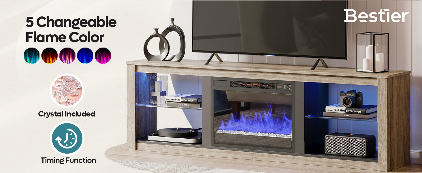 • Electric Fireplace: The fireplace features 5 changeable flame colors & 5 levels dimmer, set with temperature controller & timer to maintain air humidity. The upgraded fireplace is combined with flame and crystal to warm your room faster in a healthy way.