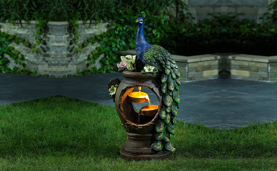 【Modern Design】Renew your outdoors with this stunning peacock fountain. This beautiful outdoor fountain features a dazzling blue peacock with is lovely detailed tail feathers perched royally on a vintage-style urn. Inside the urn, are gently illuminating LED lights so you can also enjoy the fountain at night.