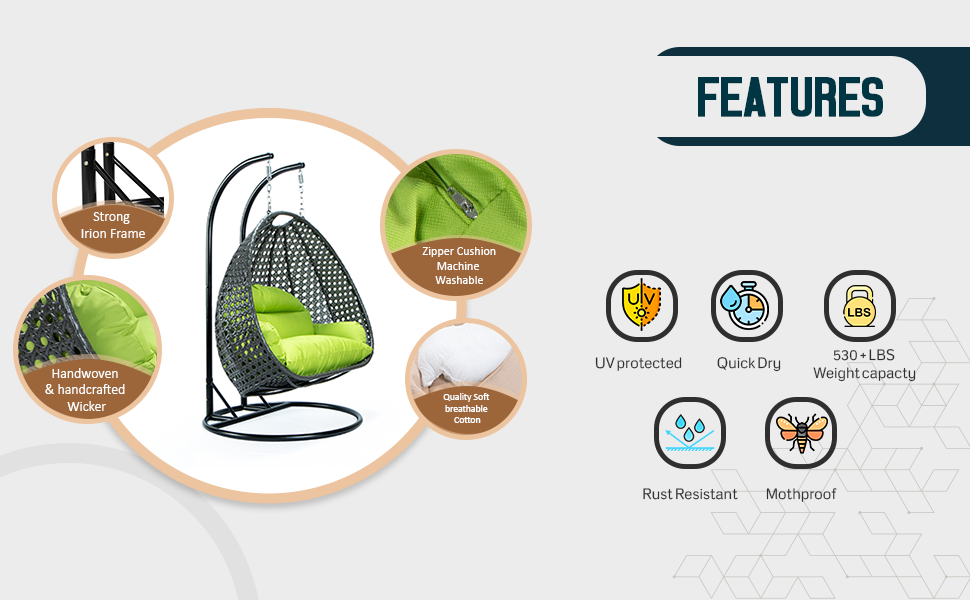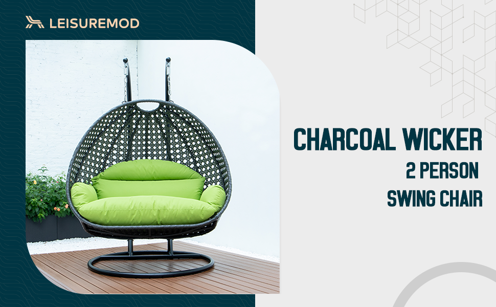Brand LeisureMod Color Light Green Material Wicker, Iron, Polyester Product Dimensions 27"D x 57"W x 78"H Item Weight 86 Pounds Frame Material Iron Maximum Weight Recommendation 529 Pounds Maximum number of compatible seats 2 Finish Type Charcoal Assembly Required Yes Item Weight 86 pounds Product Dimensions 27 x 57 x 0.99 inches Assembled Height 78 inches Assembled Width 57 inches Assembled Length 27 inches What's in the box