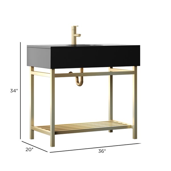 This single bathroom vanity combines modern style with an industrial feel that we love. Made with a metal base, it features a ceramic top with a rectangular silhouette set over an open-frame base. A sleek, clean-lined shape shows off a two-tone finish, while a slatted shelf on the bottom provides plenty of space for folded towels or extra toilet paper. Plus, it comes with a ceramic undermount sink and pre-drilled holes for a faucet of your choice (sold separately). At 36" wide, it's ideal for smaller bathrooms.