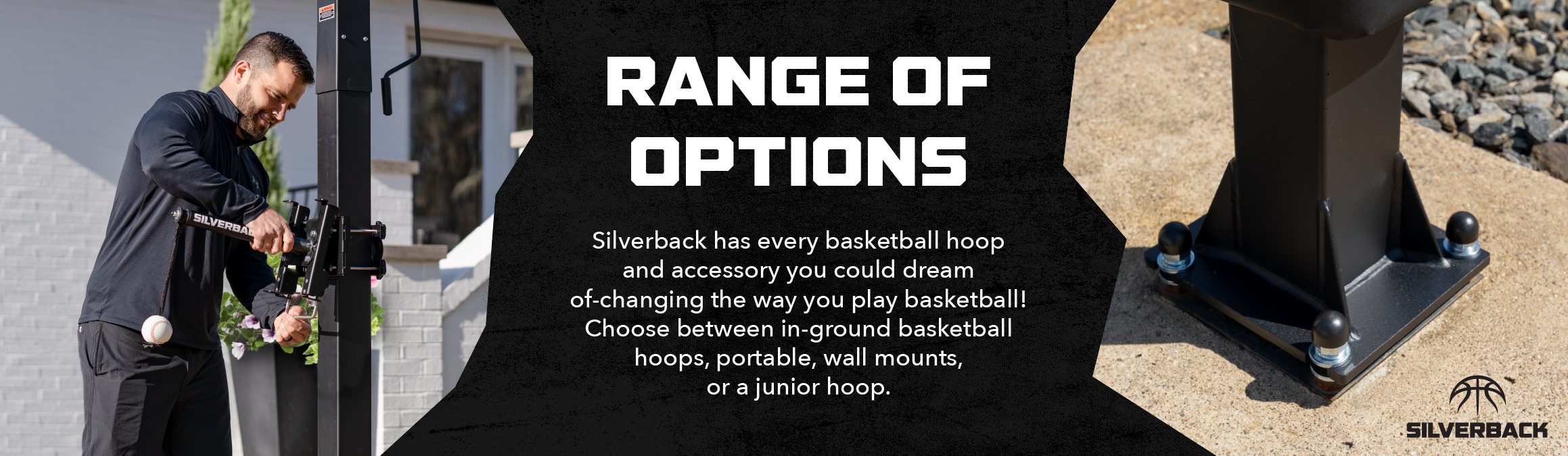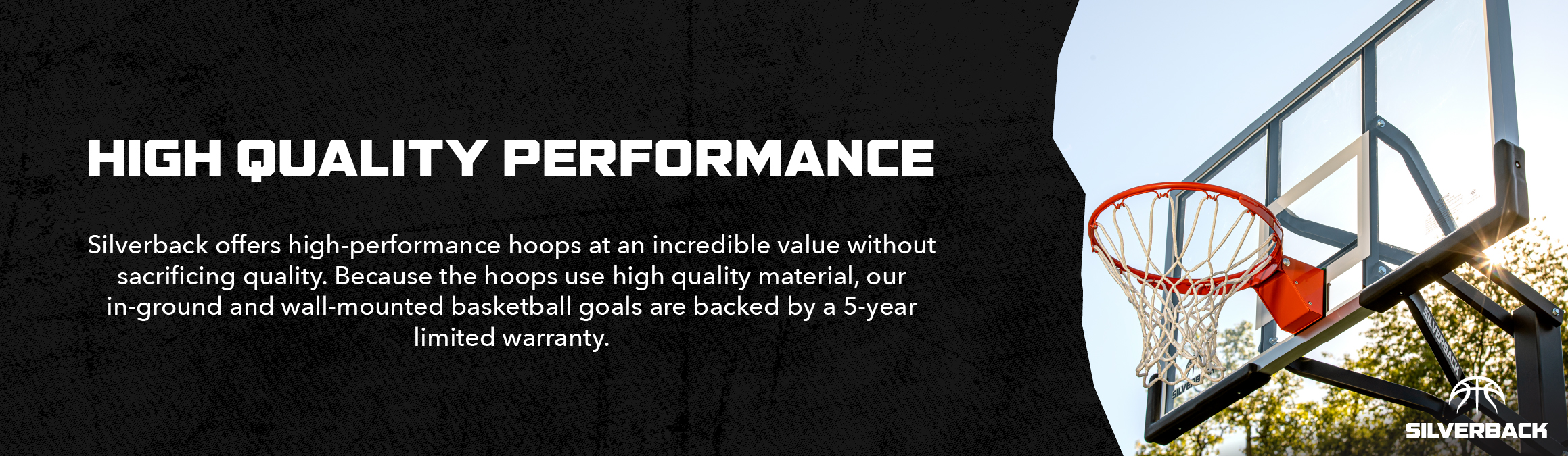 The Silverback NXT is pushing the envelope for portable basketball hoops. The advanced technology and strategic engineering of this goal makes for faster assembly, improved rebound, superior strength, unmatched stability, and effortless transportability. Compare the features of the Silverback NXT to other portable goals on the market, and you will see why this hoop is the next big thing in portable basketball hoops. - Stabili-Frame – The Silverback NXT features Stabili-Frame technology, creating unmatched stability for increased playability and added safety. The slanted pole design was engineered to offer even weight distribution across the entire base. Unlike competitor goals, the pole directly connects to the steel frame below the base, increasing the integrity of the structure. Compare to most portable hoops that utilize the blow molded base as a support structure – which is typically the first piece that fails. The shape of the base and the weighted ballast wheels create an optimal center of gravity, ensuring your goal will stay upright. Infinity Edge Backboard - Unlike traditional backboards that are framed by a plastic or metal edge, the Silverback NXT features an Infinity Edge Backboard with edges that wrap around to the back of the backboard as one continuous material. This design not only creates the modern, clean look of the hoop, but, more importantly, gives the backboard unmatched strength – greatly reducing “dead" spots in the backboard that are common among portable hoops. This technique, folds the edges of the material backward, creating a stronger face for superior rebound. Ergo-Move - The sloped base design on the Silverback NXT creates a completely unique weight distribution that allows the goal to be moved by two people with much greater ease than traditional portable basketball goals. This design enables the goal to be tilted backward onto its large weighted wheels, relieving much of the weight that a person must support, similar to the engineering of a wheelbarrow. The hoop is then easily rolled to its new location while the rear kickstand prevents the goal from tipping over. Quick-Play - No one likes long assembly projects, so the Silverback NXT was designed to make assembly as simple as possible. The NXT comes partially assembled with attached hardware, so you simply attach the major pieces using only a few required tools. The NXT allows you to assemble your goal in approximately 90 minutes, so you can start playing.