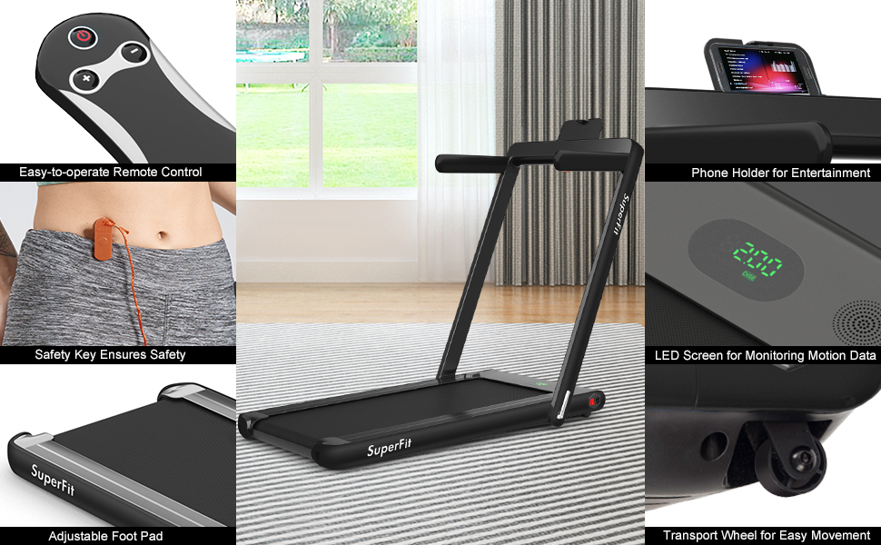 • Package Included: 1x Treadmill 1x Remote Control 1x Phone Holder 1x Safety Key